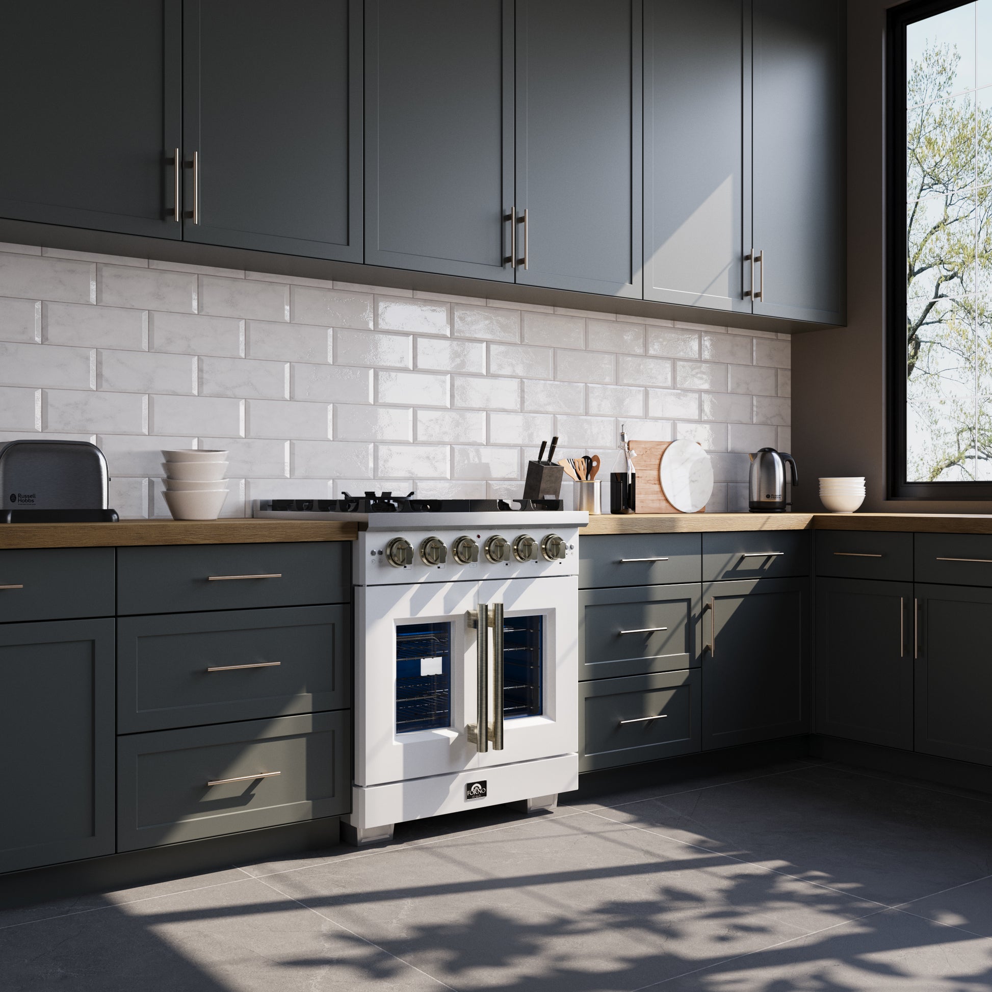 Forno Capriasca 30-Inch White Freestanding French Door Gas Range, 4 Burners, Convection Oven, Energy Efficient